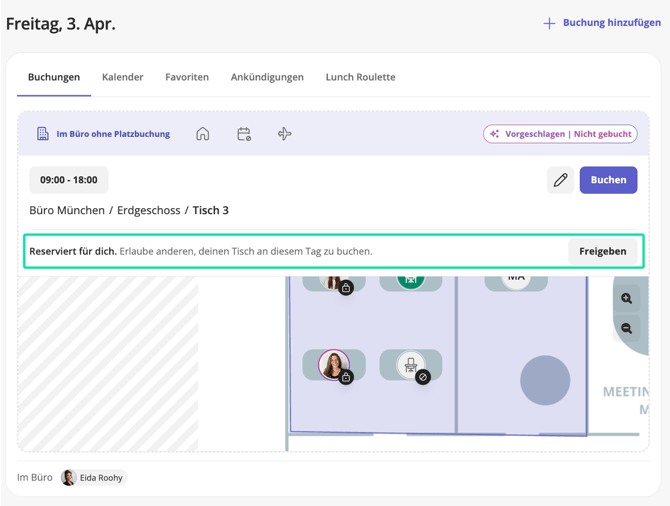 Wenn du den Tisch nicht durch Buchen bestätigst oder ihn freigibst, kann er zwar von niemand anderem gebucht werden, die Kolleg:innen können so aber auch nicht sicher sein, ob du planst, ins Büro zu kommen.