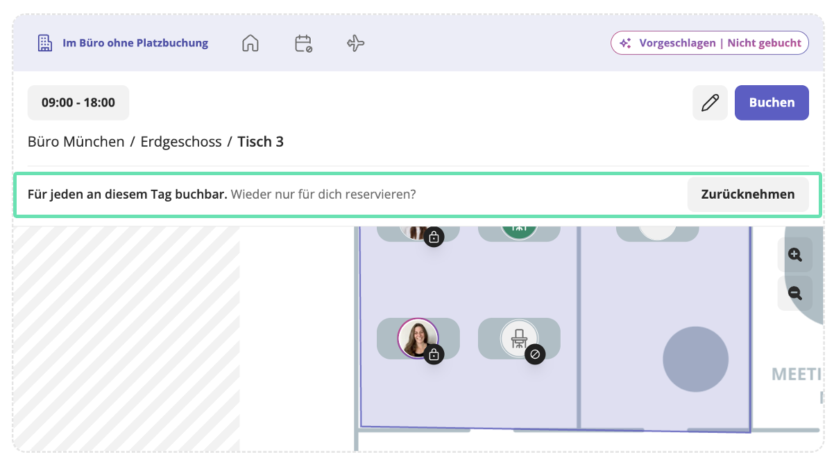 Wenn du einen fest zugewiesenen Arbeitsplatz oder Parkplatz hast, kann niemand anders deinen Platz buchen. Allerdings wird dann noch nicht im Treffen angezeigt, dass du ins Büro kommst - das kannst du ändern, indem du in der Planungsansicht über den "Buchen" Button bestätigst, dass du deinen Platz selbst nutzen möchtest.