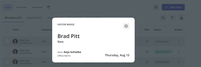 - Mit Klick auf den Namen des Besuchers, öffnet sich der Besucherausweis, der direkt zum ausdrucken heruntergeladen werden kann.