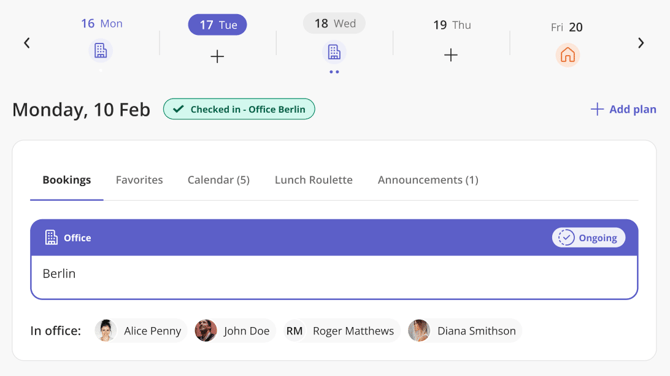 Für Mitarbeitende, die keinen Arbeitsplatz gebucht hatten, aber im Büro sind, wird neben dem Datum ein grüner Check-in Badge angezeigt und eine Buchungskarte mit dem Büronamen.